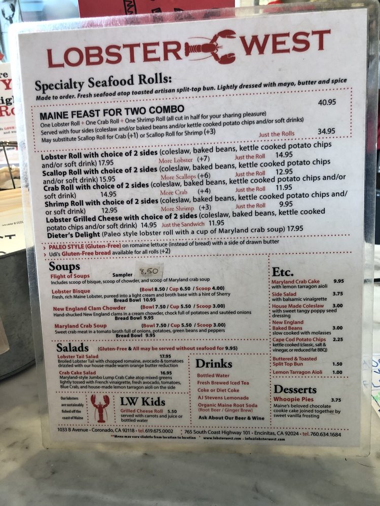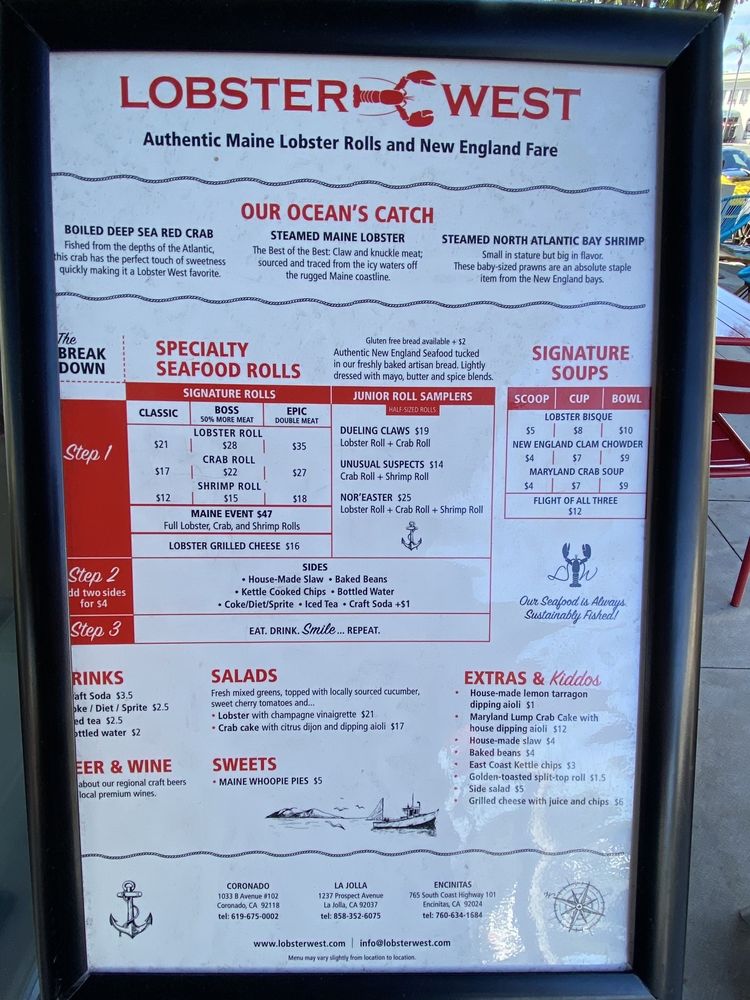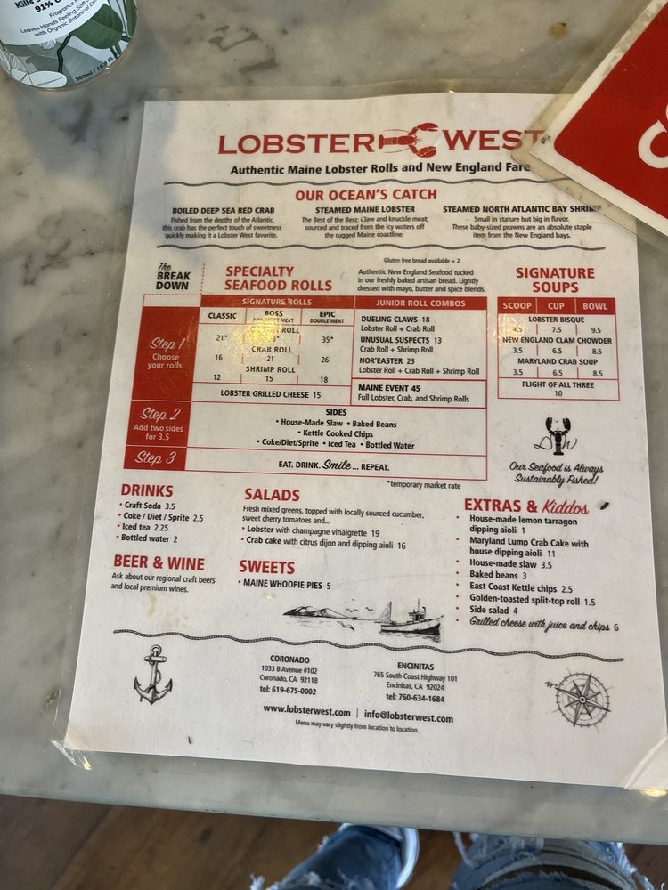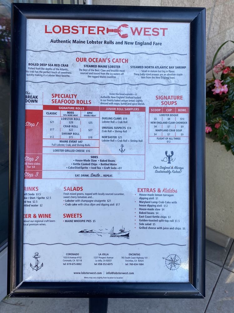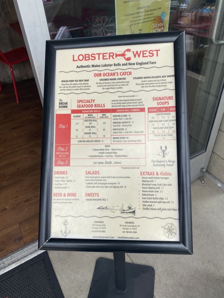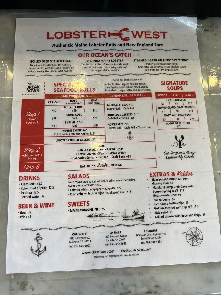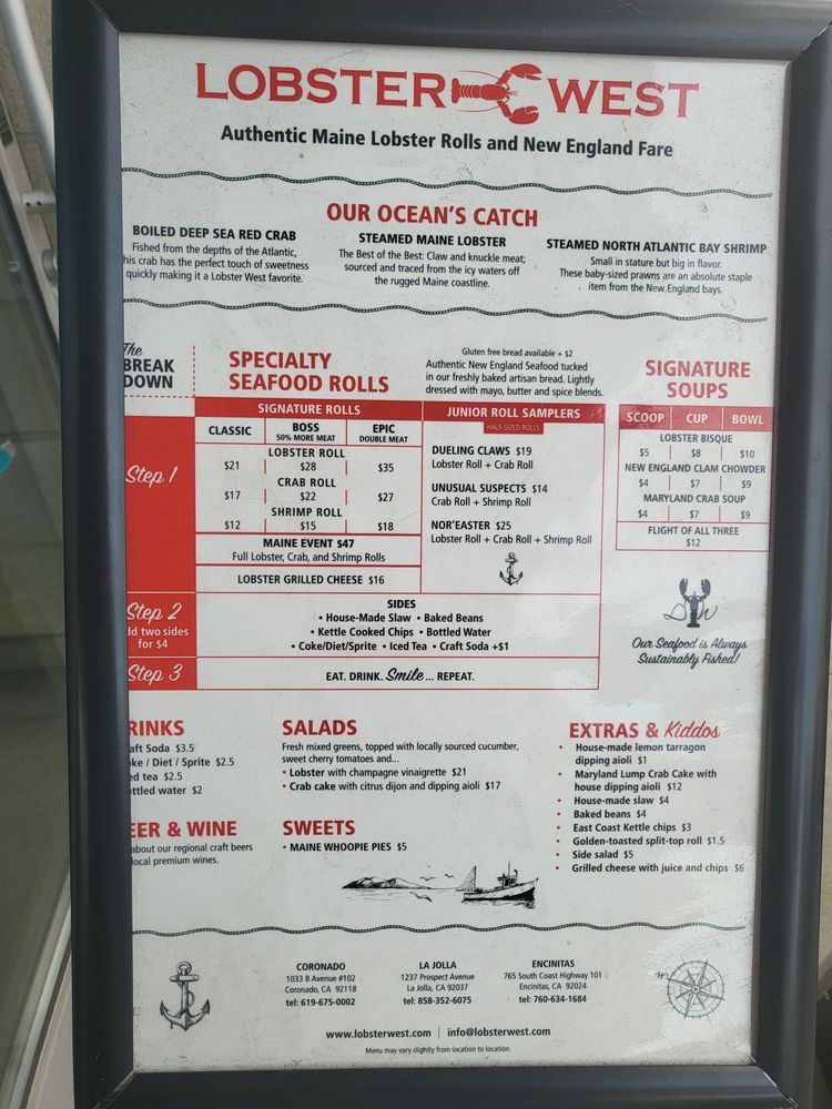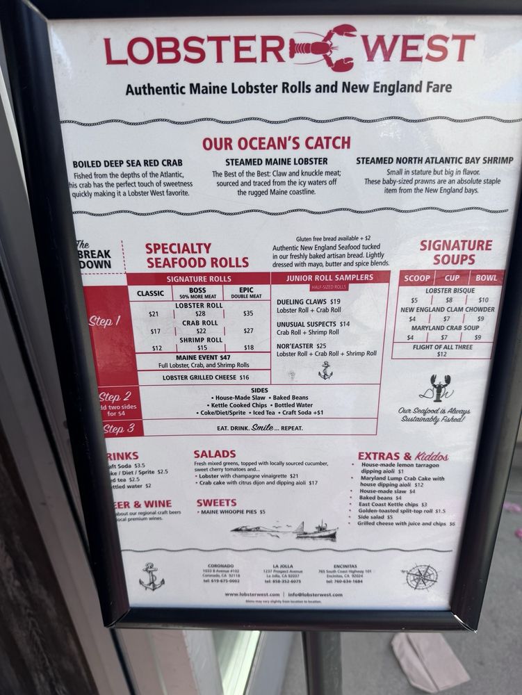 Lobster West, a seafood gem located in Coronado, CA, offers a delightful menu showcasing their specialty rolls and combos. The Classic Crab Roll, dressed with drawn butter and a tasty spice blend, is a must-try for seafood lovers. The menu also includes options like the Boss Crab Roll, loaded with sweet red crab, and the Epic Crab Roll for those looking to indulge. Pair your roll with sides like baked beans, coleslaw, or chips for a satisfying meal. Don't miss out on their Clam Chowder, served in various sizes, or the crowd-favorite Lobster Bisque. With a range of offerings and a welcoming atmosphere, Lobster West is the perfect spot for a casual dining experience with friends and family.